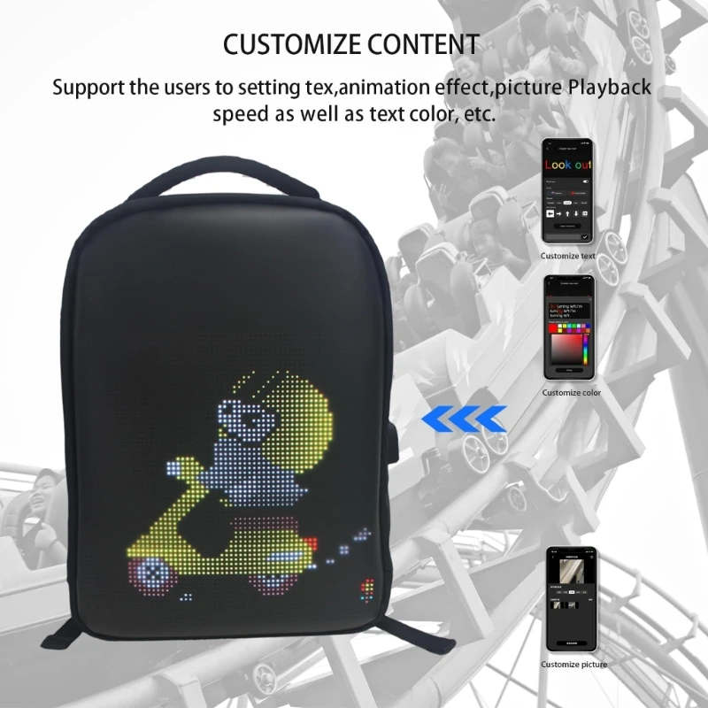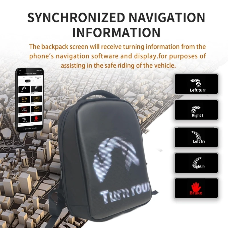 Migliora il tuo stile con questi zaini LED per esterni da 15,6 pollici, uno schermo programmabile da 64x64 pixel che visualizza animazioni, testo e grafica attraverso la sua struttura impermeabile in PU+PV+tela perfetta per gli appassionati di zaini LED che cerca display personalizzabili.